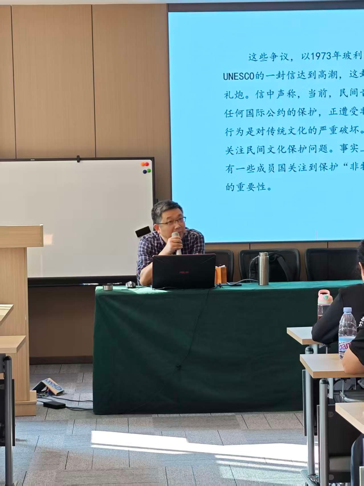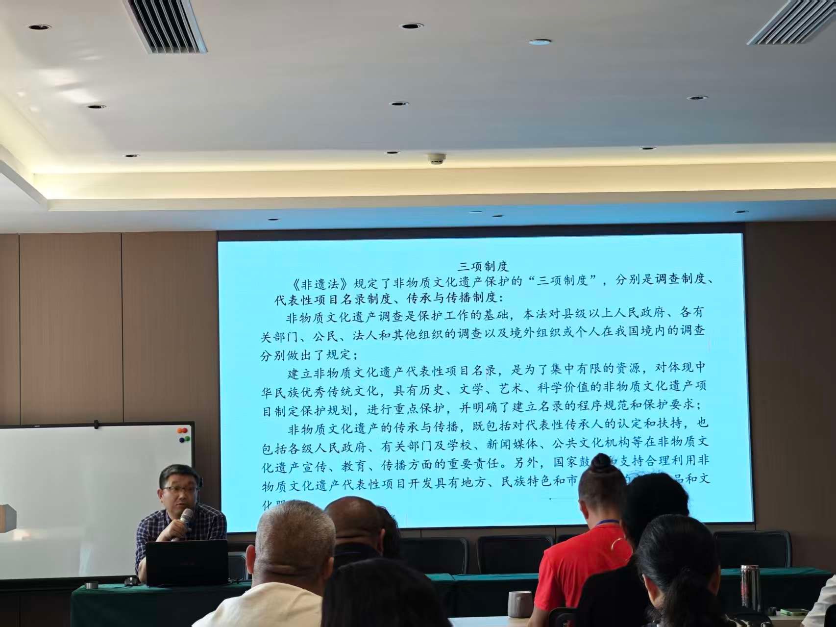紧接着,杨教授重点剖析了“非物质文化遗产保护的法律体系”。他详细介绍了从国际公约到国内《非物质文化遗产法》《知识产权法》等相关法律规构成的多层次、立体化保护网络,阐述了公法与私法在非遗保护中各自的作用与协同机制,帮助学员们明晰了权利边界与法律依据。