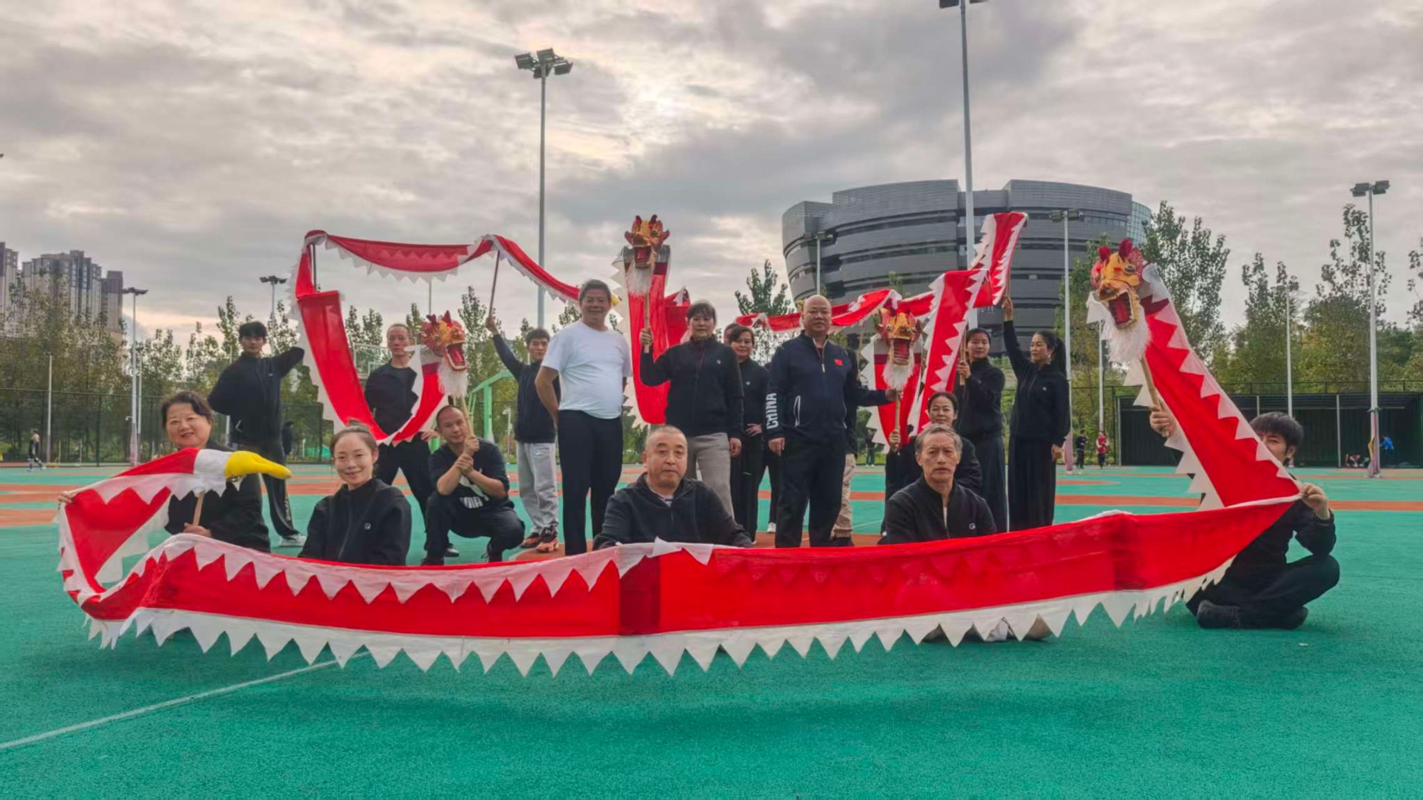 10月24日至25日,研修班进入实践融合阶段,重点开展 “非遗龙灯舞(小金龙)与峨眉武术融合”训练。在户外训练场地,传承人亲自示范小金龙的舞弄技巧——红绸白边的龙身灵动翻飞,龙头时而腾跃、时而盘旋,与峨眉武术的桩功、步法、身法巧妙结合。学员们手持龙具,将武术的劲力与龙灯舞的韵律相融合,一招一式间既展现出峨眉武术的刚劲,又体现出龙灯舞的柔美,形成了独具特色的“文武融合”表演形式。训练中,学员们反复打磨动作配合,从舞龙的技巧把控,到多人团队的阵型变换,力求让龙灯舞的灵动与峨眉武术的劲道完美契合。