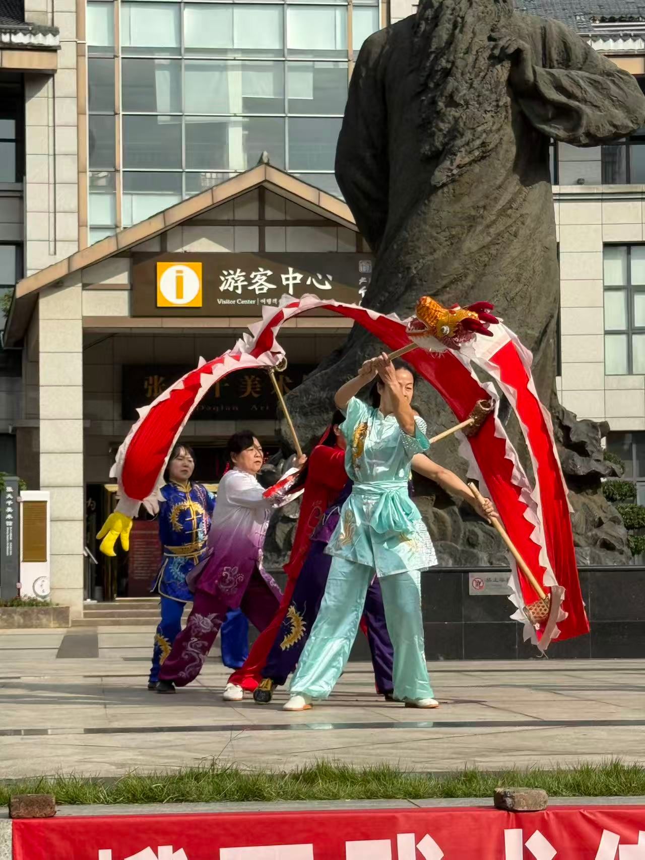 展演的第一部分是由学员们组成的团队展示。队员们身着统一的武术服,手持各类兵器,在广场中央依次展示峨眉武术的基本功和技巧动作。随着他们的一招一式,整个场面气势磅礴,武术的力量与美感相结合,给在场的观众带来了极大的震撼。特别是一些学员的舞龙表演,巧妙地融合了峨眉武术的刚猛和舞龙的柔美,展现出两者之间的完美协作与和谐美。