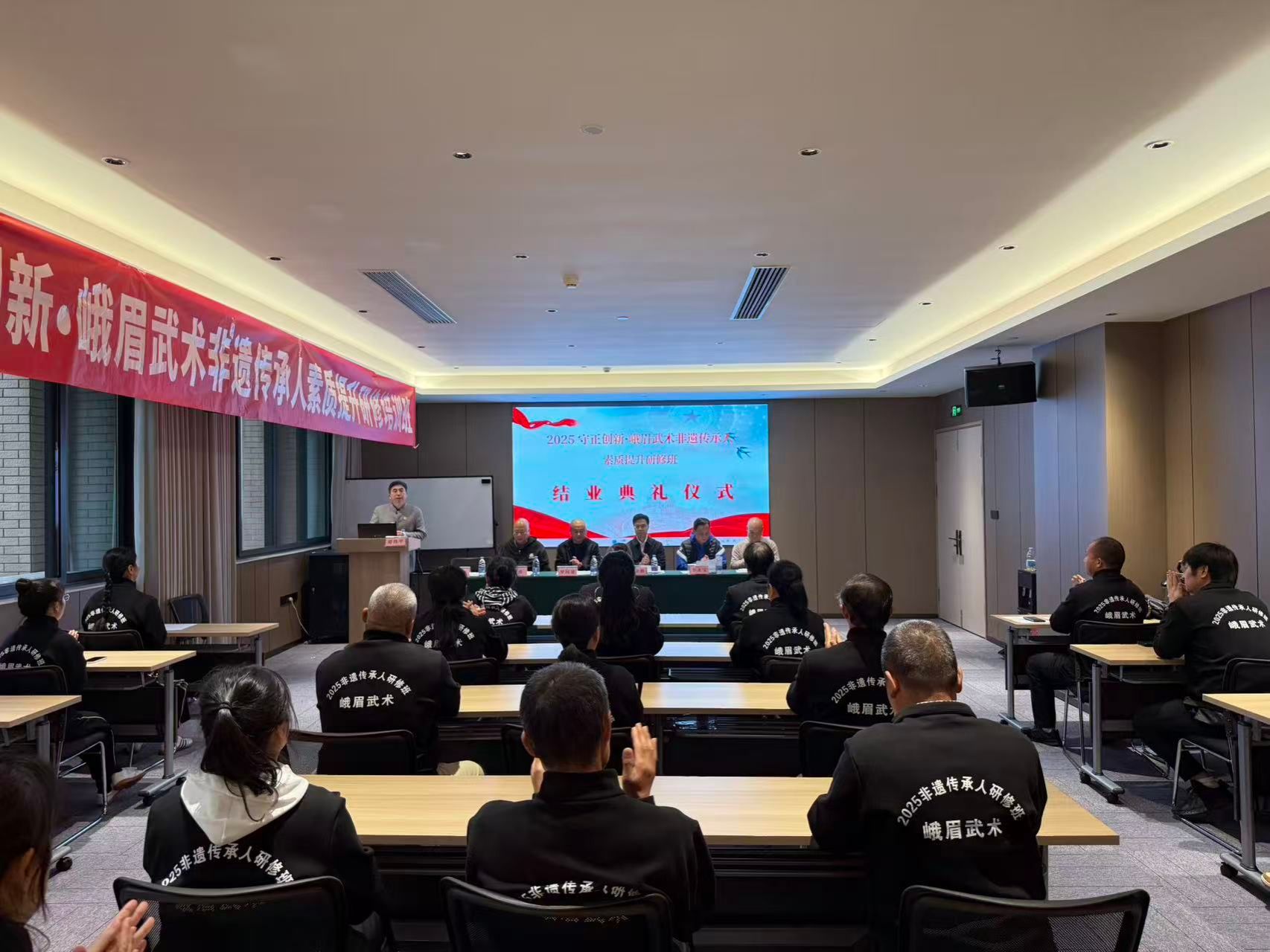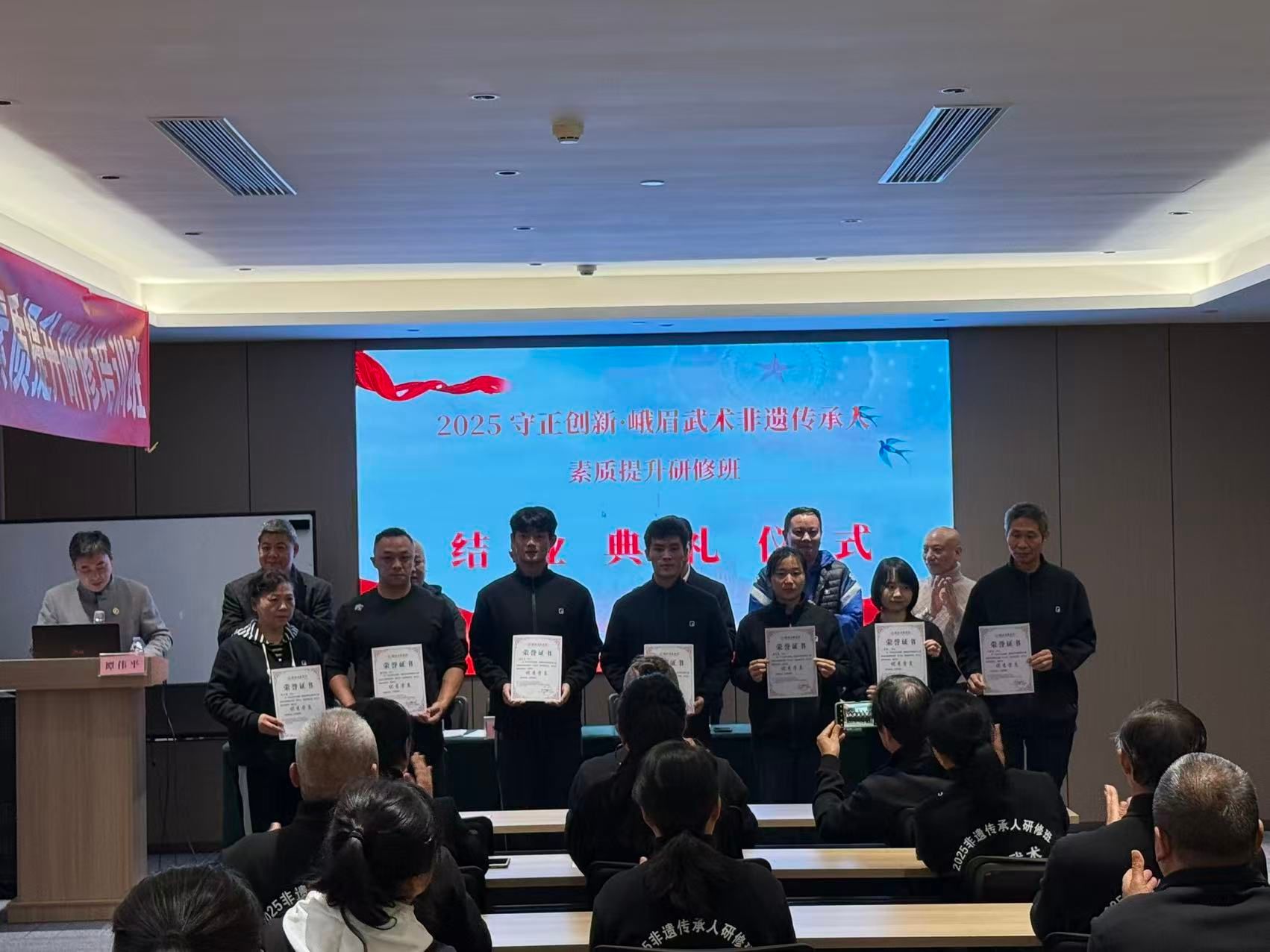 2025年11月4日,2025守正创新・峨眉武术非遗传承人素质提升研修班结业考核顺利完成,随后于瑞丰酒店三楼举行结业仪式,为合格学员颁发结业证书及优秀学员证书,标志着本次研修班圆满落幕。