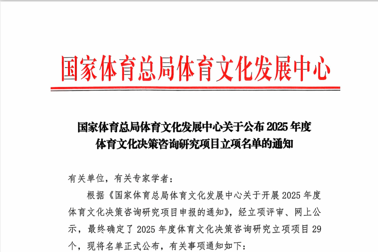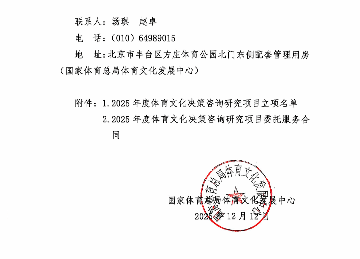 该项目2025年12月12日正式发布,是国家体育总局体育文化发展中心2025年度立项的29个项目之一,后续需按要求完成《委托服务合同》签署、项目实施及结项成果的提交。