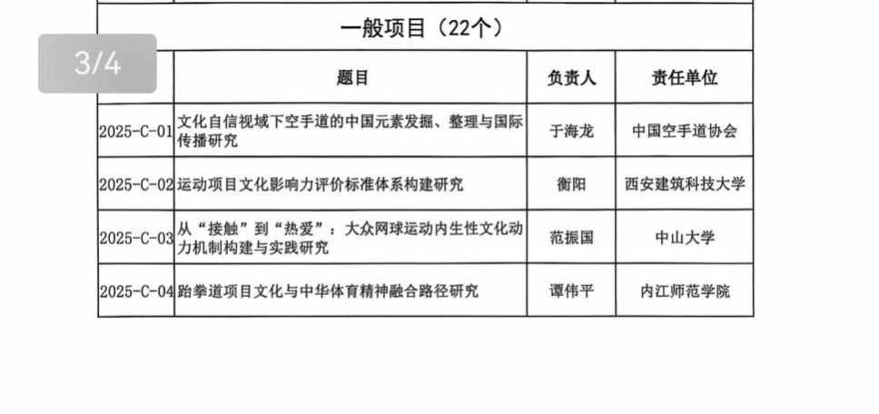2025年12月10日,国家体育总局体育文化发展中心通过官方渠道公示了 2025年度体育文化决策咨询研究项目立项名单,由内江师范学院教育部中华优秀传统文化峨眉武术传承基地主任谭伟平教授负责申报的《跆拳道项目文化与中华体育精神融合路径研究》(项目编号:2025-C-04)成功入选“一般项目”类别。
