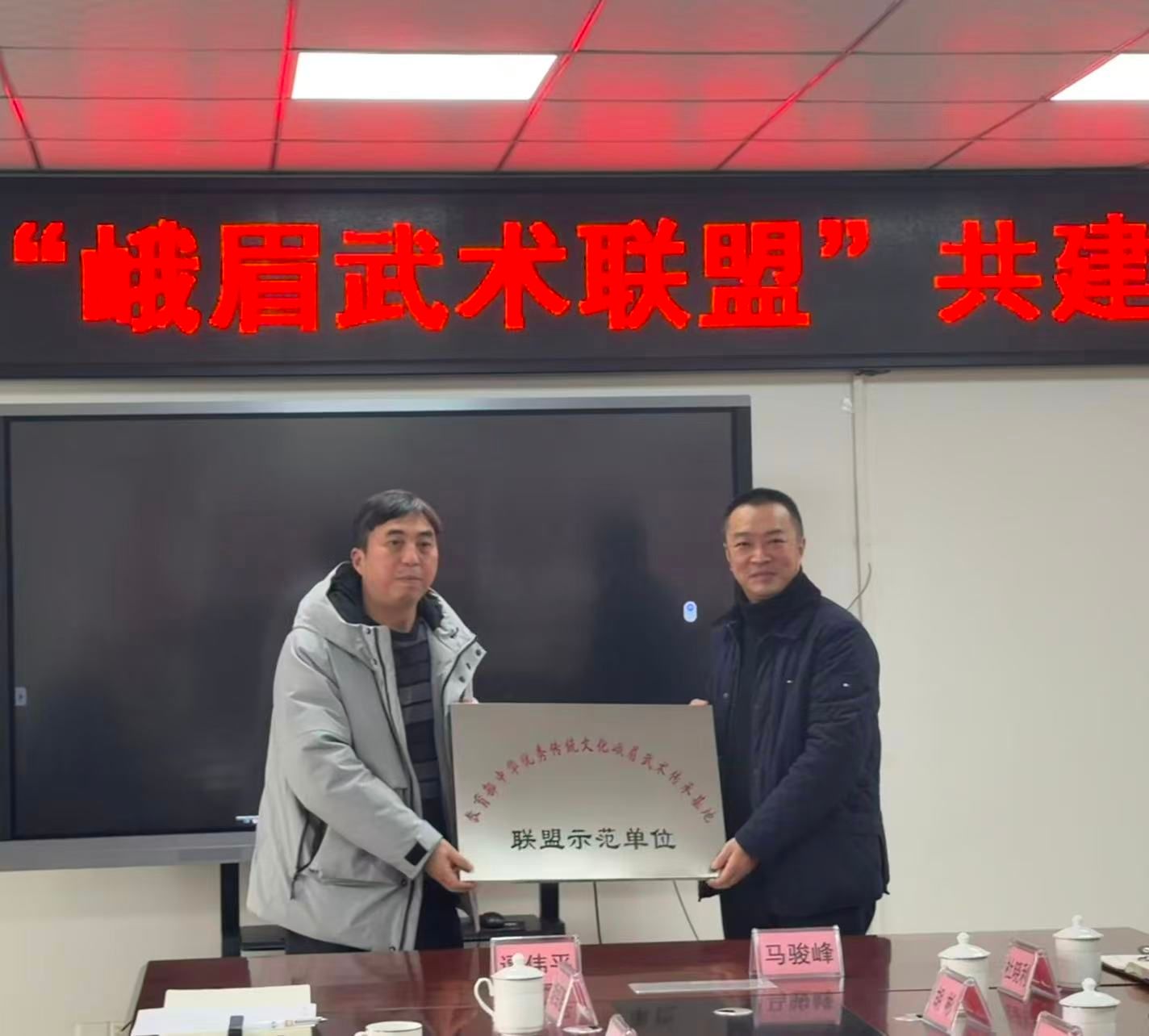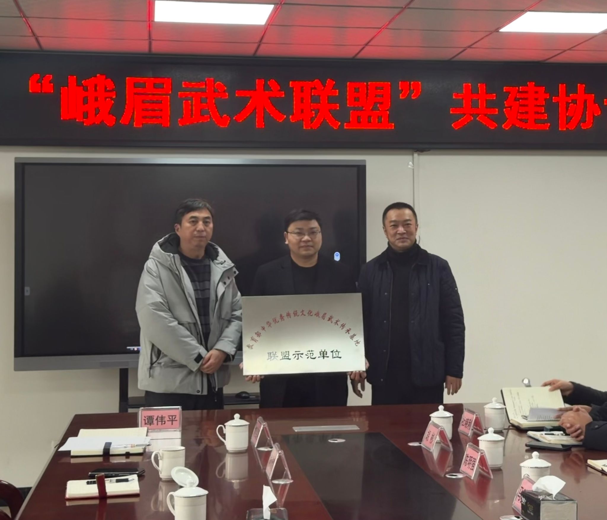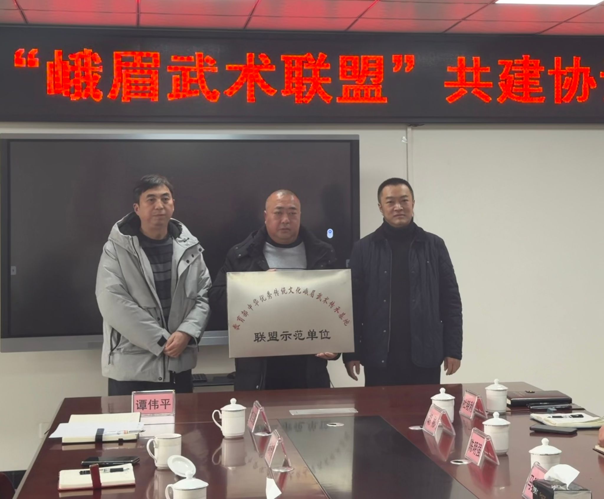 签约仪式后,谭伟平教授为四所学校逐一授予 “教育部中华优秀传统文化峨眉武术传承基地合作示范单位” 牌匾,标志着 “峨眉武术合作” 正式落地泸县校园。