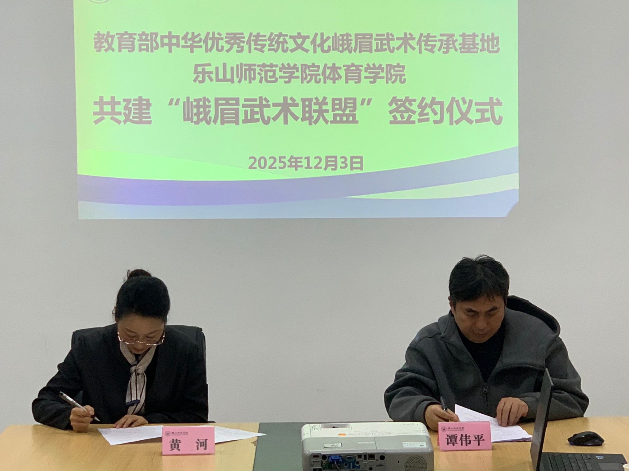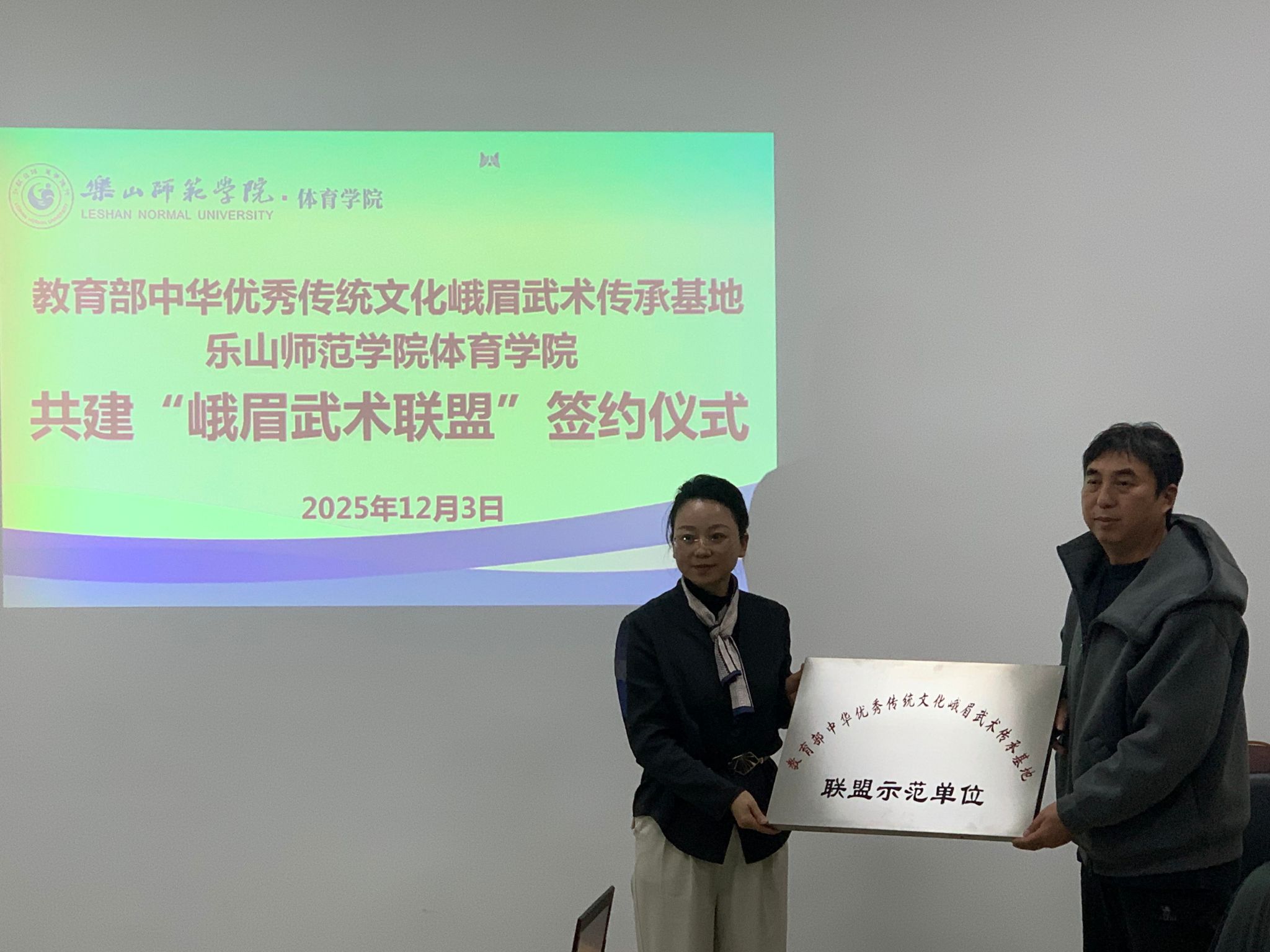 此次仪式由内江师范学院峨眉武术基地主任谭伟平教授、乐山师范学院体育学院院长黄河领衔参与。谭伟平与黄河分别代表双方签署共建协议书,明确合作的合作框架与核心方向;谭伟平代表传承基地,向乐山师范学院体育学院授予“峨眉武术合作示范单位”牌匾,标志合作进入实质性推进阶段。