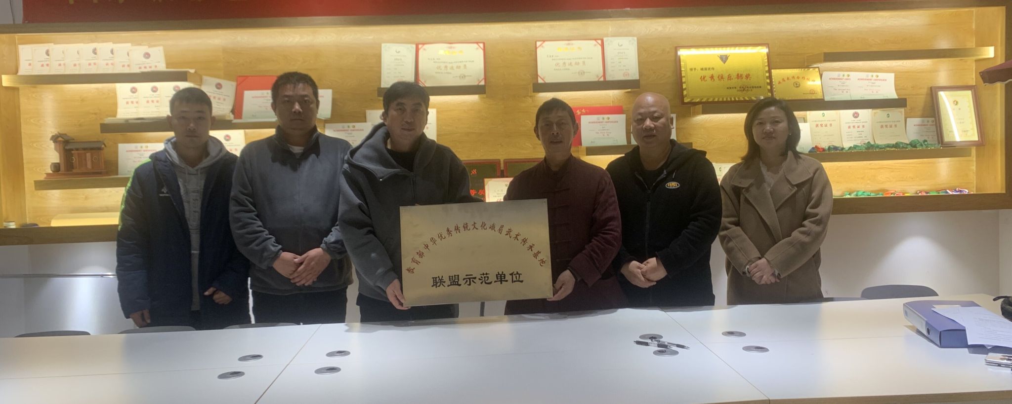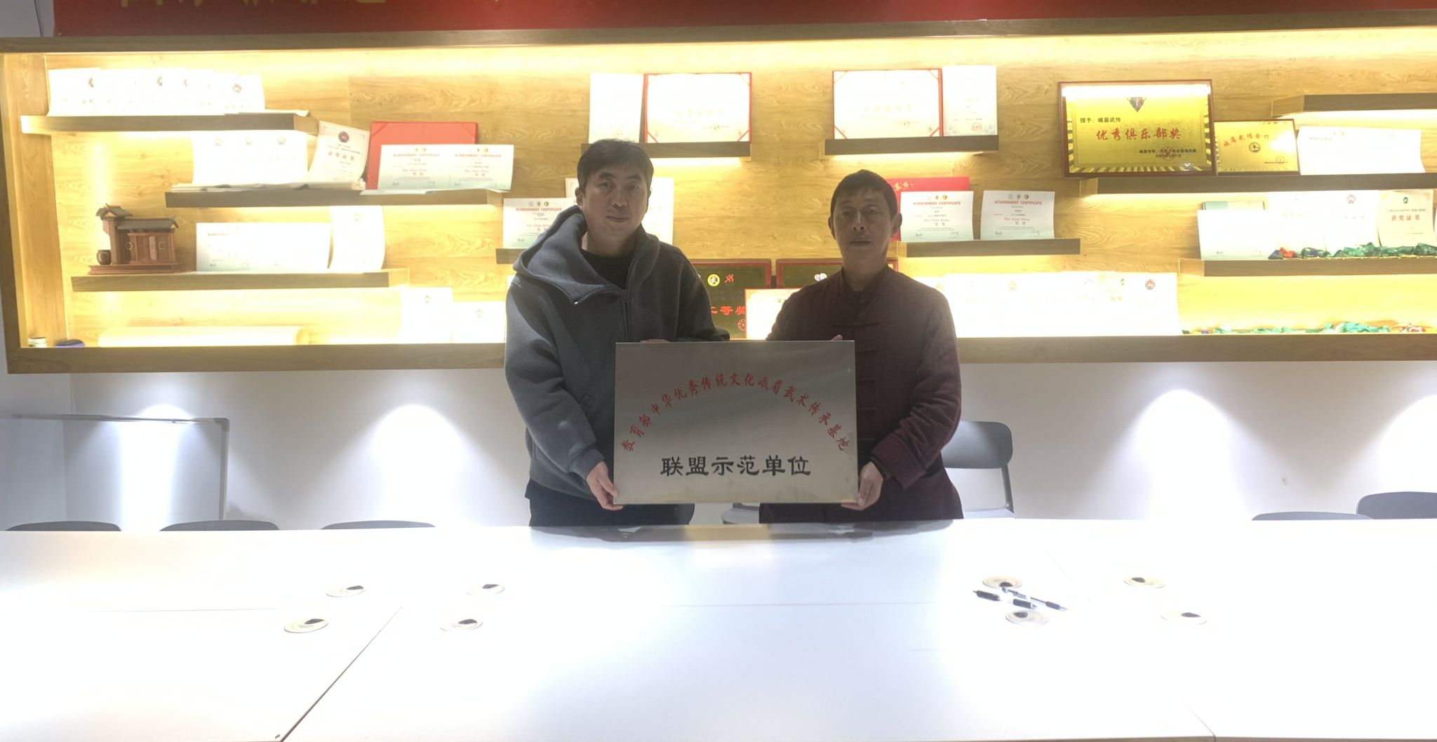 仪式现场,内江师范学院峨眉武术基地主任谭伟平教授,与峨眉山武传武术培训学校有限公司负责人、国家级非物质文化遗产峨眉武术代表性传承人王超,共同签署《“峨眉武术合作”共建协议书》;随后谭伟平代表基地,向培训学校授予“教育部中华优秀传统文化峨眉武术传承基地示范单位”牌匾,双方团队合影留念,标志着校社协同传承峨眉武术的合作正式启动。